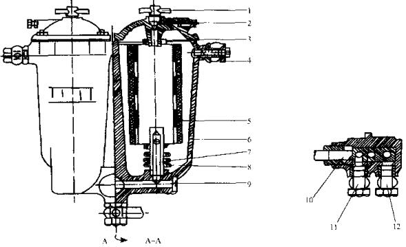 柴油發電機組燃油濾清器主要由濾芯、外殼及濾清器座三部分組成,各機型均通用,唯有溢流閥8有兩種結構,根據不同機型選用C0810A或C0810B濾清器。12缸V型柴油發電機組用C0810A、C0810B各一只并聯安裝。