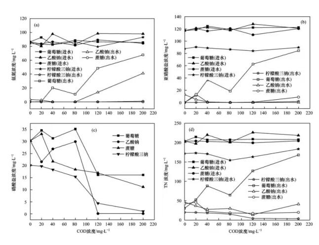 實驗進水NH4+-N和NO2--N濃度分別為80 mg˙L-1和120 mg˙L-1.考察4種有機物葡萄糖、蔗糖、乙酸鈉、檸檬酸三鈉在COD濃度梯度0、20、40、80、120、200 mg˙L-1時對厭氧氨氧化反應的影響.
