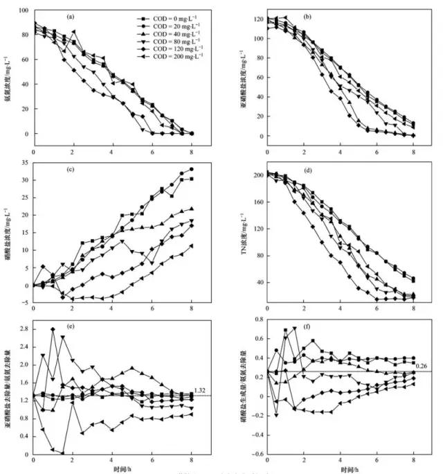 從圖 6(e)、6(f)中可以看出當蔗糖濃度大于40 mg˙L-1時,NO2--N與NH4+-N去除量的比值先升高后降低最后接近理論值,而NO3--N生成量與NH4+-N去除量的比值正好相反先降低后升高然后逐漸接近于理論值,而且NO2--N與NH4+-N的比值先升高或NO3--N與NH4+-N的比值先降低的過程隨著蔗糖濃度的升高逐漸變短.這一過程與之前葡萄糖和乙酸鈉不同,可能是因為蔗糖更容易被反硝化菌代謝.隨著反應的進行,系統中有機物被消耗,反硝化作用受到抑制,NO2--N去除量/NH4+-N去除量與NO3--N產生量/NH4+-N去除量的值逐漸接近理論值.