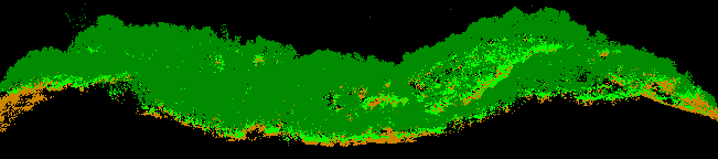 圖9輸電走廊植被點提取結果(上圖:剔除電力線、電塔和建筑點后的非地面點;下圖:植被激光點,其中深綠色為高植被,淺綠色為低植被,棕黃色為地面點)