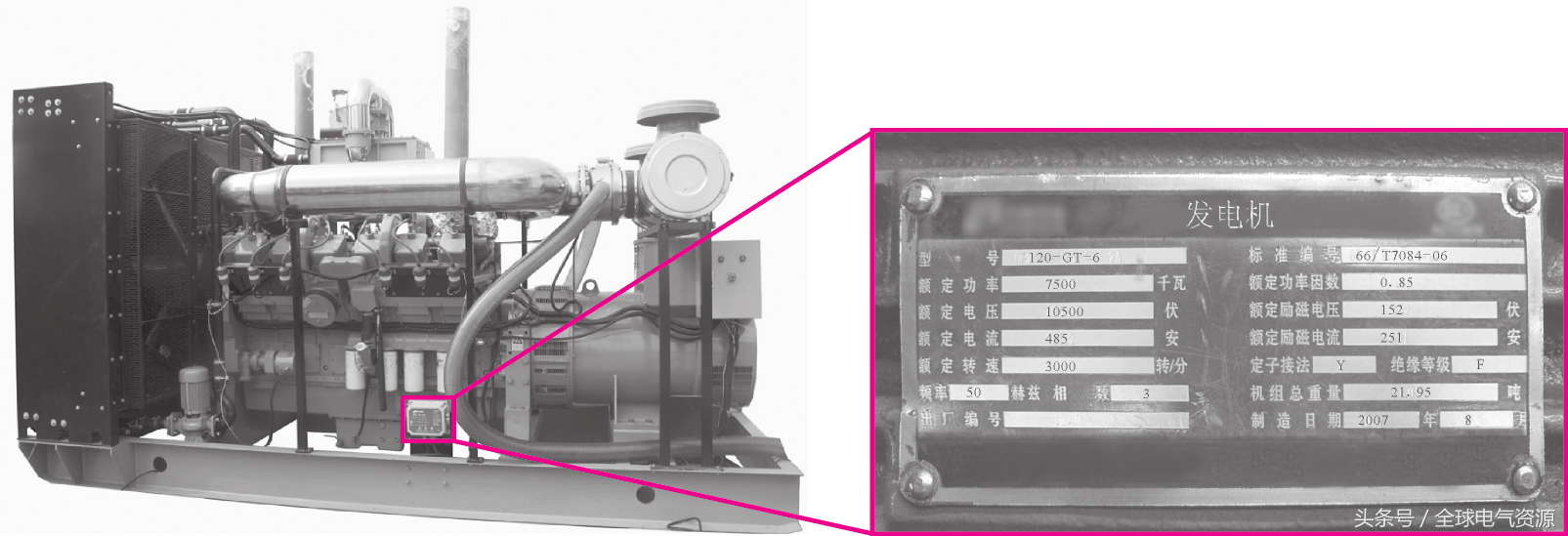 2、發電機型號和技術參數為了便于發電機的生產管理和使用,國家建立了統一的發電機型號方法,發電機銘牌附在其外殼的明顯位置。 包括的參數主要有發電機型號、額定電壓、額定功率、額定功率、絕緣等級、頻率、功率因數、轉速等。