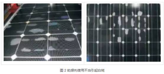 電池焊接時,助焊劑使用不當,造成EVA與助焊劑產生反應,在電池表面形成大量白斑,組件功率大幅度下降。